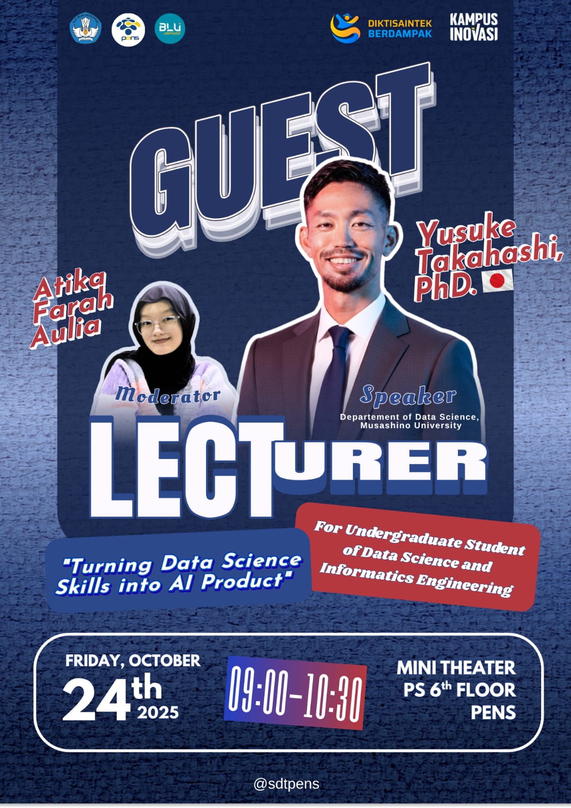 sainsdata.pens.ac.id – Departemen Teknik Informatika dan Komputer, Politeknik Elektronika Negeri Surabaya (PENS) kembali menyelenggarakan kegiatan kuliah tamu yang inspiratif bertajuk “Turning Data Science Skills into AI Product” pada: