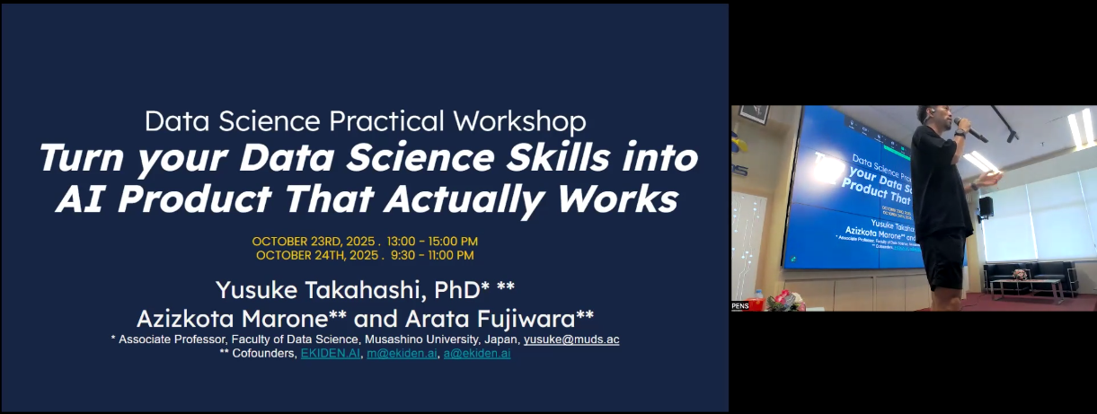 Kegiatan ini menghadirkan narasumber internasional, Yusuke Takahashi, Ph.D, dari Department of Data Science, Musashino University, Jepang. Beliau berbagi wawasan mengenai bagaimana keterampilan data science dapat dikembangkan lebih jauh menjadi produk kecerdasan buatan (AI) hingga memiliki nilai nyata serta dampak yang luas.